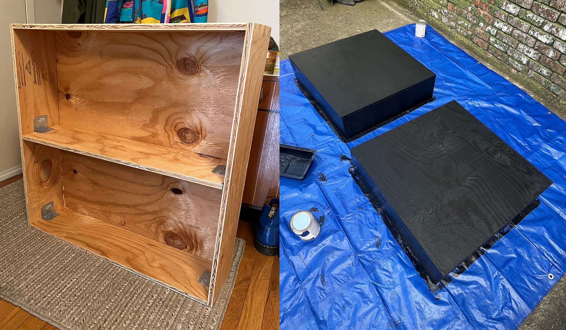 I started by overbuilding the heck out of the risers, because they were going to be hauled around and stomped on. Glue! Screws! Brackets! And I painted them with the blackest black paint I could find.