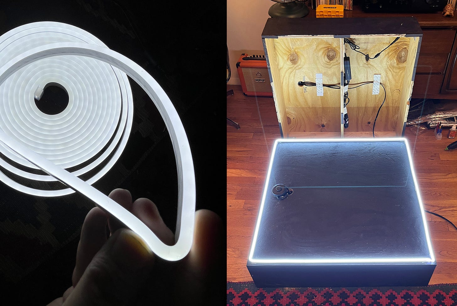 Then, a problem. There was a 2-4 second delay between hitting the foot switch and the lights coming on. Technically speaking, and forgive me if this goes over your head, the power supply wanted to gobble up some juice before passing it along. And I didn’t have a great solution for it. But OH YEAH. It’s a dang clown show! When I shared my progress, Ethan and Gigi loved the delay and immediately schemed about ways to play with it. So… I meant to do that. Whew.