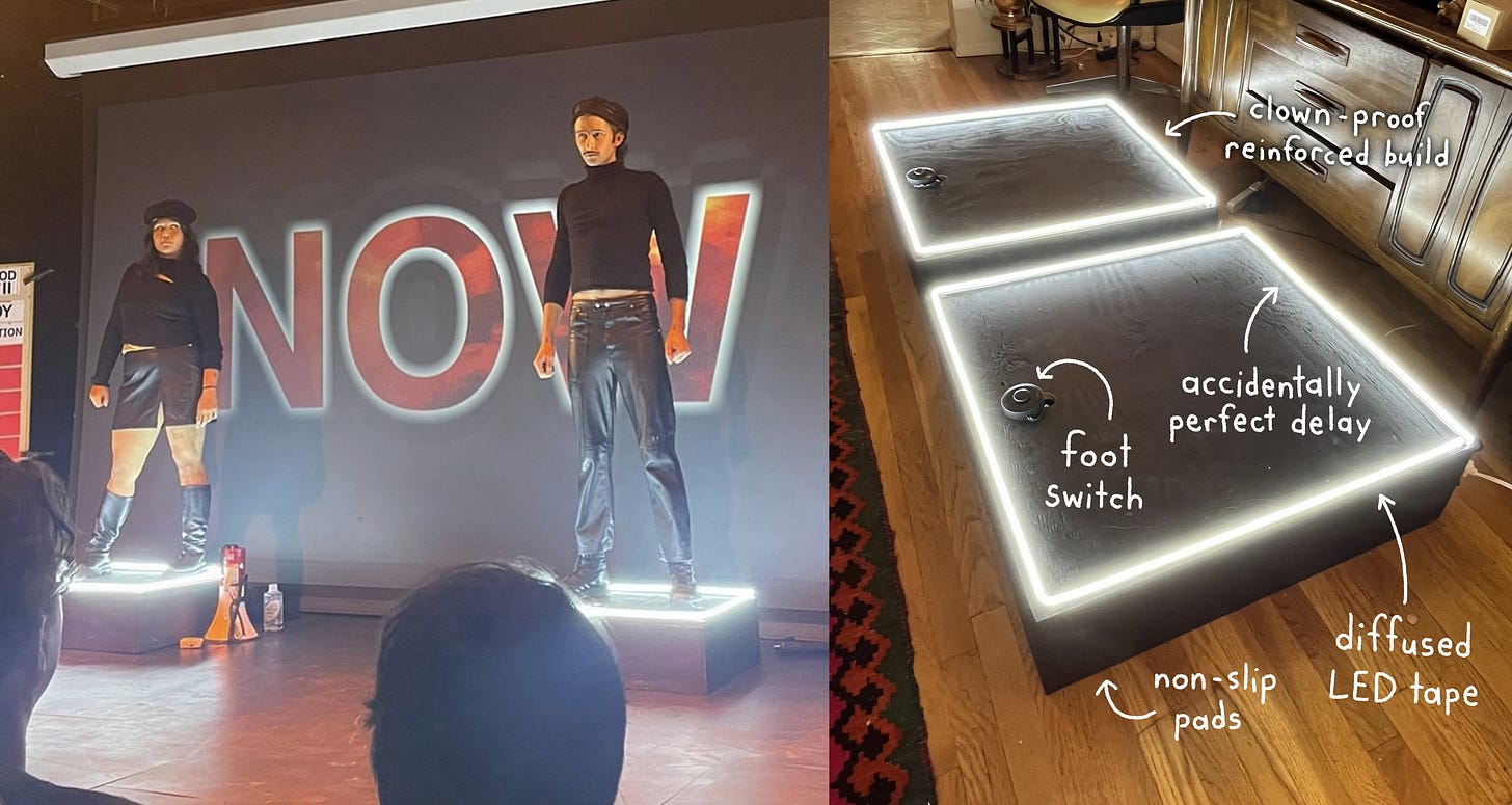 Back in September, I took over my living room for a week building light-up Twin Tower stage risers for Ethan & Gigi’s THE MOVEMENT, a show about two well-meaning artists trying to create “America’s First Good 9/11”. It was a perfect project, because it was multi-disciplinary (woodworking, painting, electrical), I learned new skills (I’d never built anything with LED strips or foot switches), and I got to fulfill someone else’s vision (which is a fun challenge). There was concept art, and they knew what dimensions they wanted. After that… we just had to figure it out.