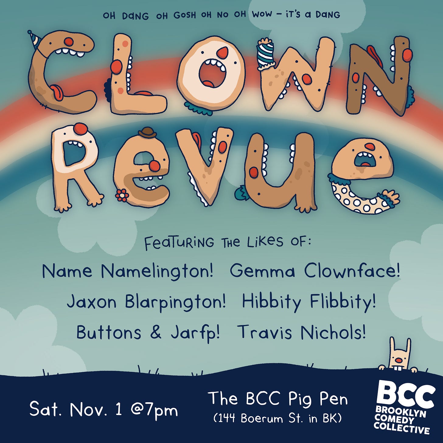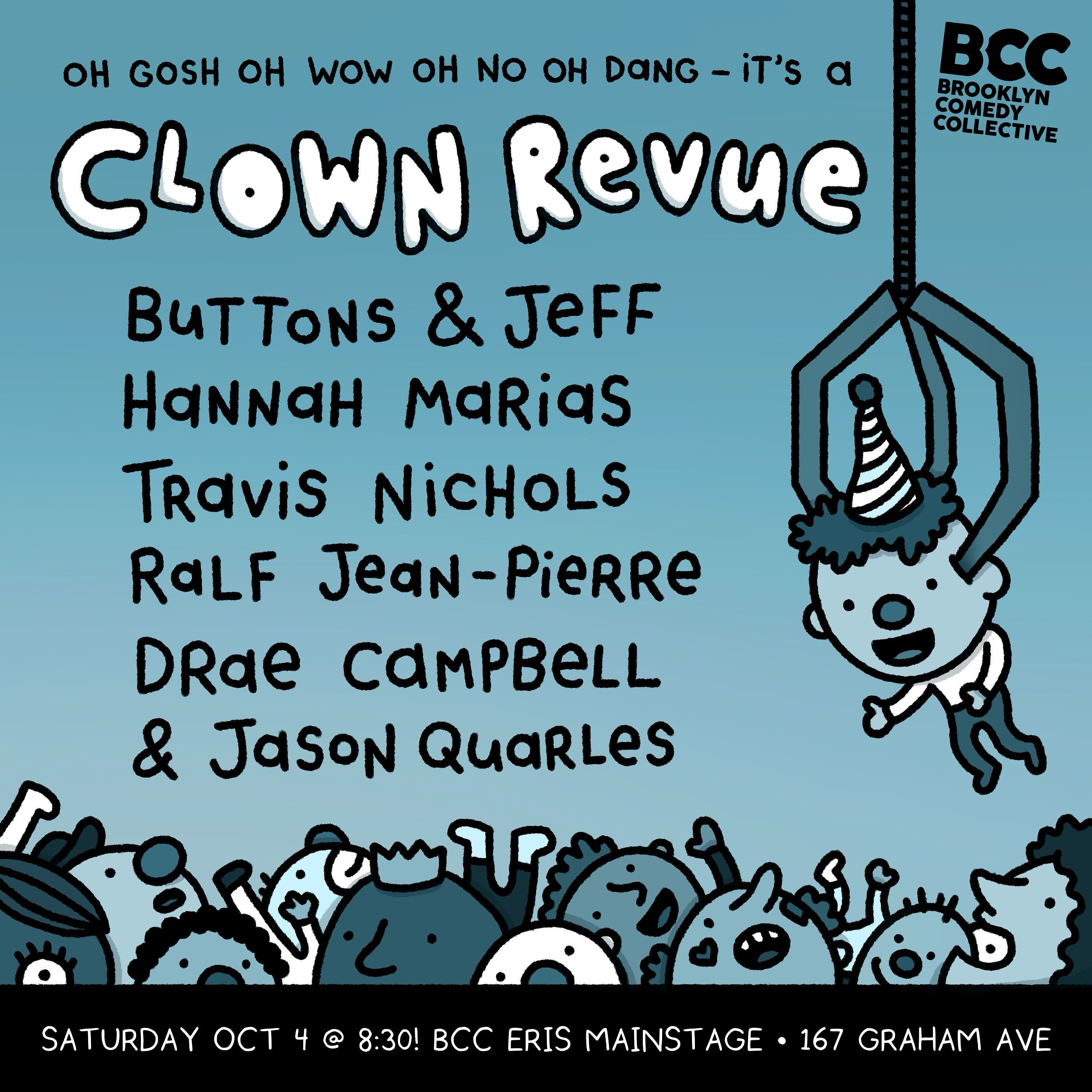 Since writing PART ONE, I’ve done a few more show posters. I offered to do a poster for a Clown Revue at Brooklyn Comedy Collective, and later I was commissioned to create an evergreen version that they could use over and over. So the second version below (with the placeholder names) has tweakable text layers for performers and dates.